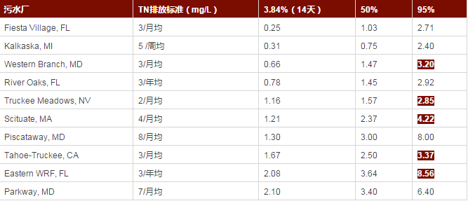 技術可達到的可靠標準:可靠性是基于第95百分位的統(tǒng)計計算,主要是考慮到美國的很多污水處理廠的排放標準是用月均值,也就是如果在連續(xù)5年的運行中,超標的月均值可以有3次,這樣的結果通常被認為技術是可靠的。
