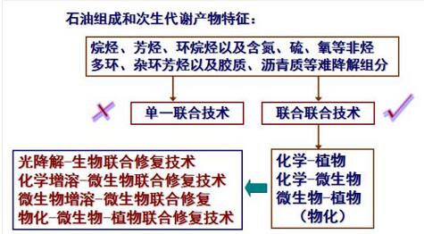 石油是烷烴、芳烴、環(huán)烷烴及含氮、硫、氧等非烴類組分的混合物,其中多環(huán)、雜環(huán)芳烴以及膠質(zhì)、瀝青質(zhì)等組分生物降解性較差。石油及次生代謝產(chǎn)的組成特征決定了修復(fù)的難度和復(fù)雜性。因此, 單一聯(lián)合技術(shù)不能很好的解決污染問題時(shí),需要考慮聯(lián)合使用各種處理技術(shù)。