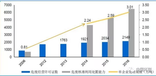 根據(jù)《固體廢物污染環(huán)境防治法執(zhí)法檢查報(bào)告》顯示,2016年全國持危險(xiǎn)廢物經(jīng)營許可證的單位設(shè)計(jì)處置能力為6471萬噸,實(shí)際經(jīng)營規(guī)模只有1629萬噸,實(shí)際處理比例僅為25%。