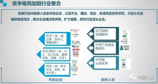 危廢市場格局是危廢行業(yè)內(nèi)新進(jìn)入者及傳統(tǒng)企業(yè),及外企、國企、民企,形成高度競爭狀態(tài)。在環(huán)保調(diào)控力度加強(qiáng)的情況下,很多資本躍躍欲試,進(jìn)入危廢處置行業(yè),包括一些大型集團(tuán),房地產(chǎn)企業(yè),綠化企業(yè),或者投資機(jī)構(gòu)等。企業(yè)跑馬圈地和異地收購將會持續(xù)下去,搶占危廢市場或?qū)⒂萦遥罅啃∑髽I(yè)被收購或淘汰,部分企業(yè)通過收并購、擴(kuò)大規(guī)模,成為行業(yè)龍頭企業(yè)。