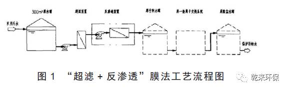 3.1流程西區(qū)輸來(lái)回用污水會(huì)流入到300 m3 的原水罐里,接下來(lái)經(jīng)過(guò)原水提升泵進(jìn)入到可以去除膠體以及細(xì)菌等的超濾裝置中,當(dāng)超濾出水的水質(zhì)滿足反滲透裝置進(jìn)水時(shí),將還原劑和阻垢劑投入到超濾出水口經(jīng)高壓泵加壓后進(jìn)到可以去除溶解鹽類的反滲透裝置中,反滲透產(chǎn)水再進(jìn)入原有離子交換系統(tǒng)進(jìn)一步除鹽后用于鍋爐補(bǔ)給水。如圖1 為“超濾+ 反滲透”膜法工藝流程圖。