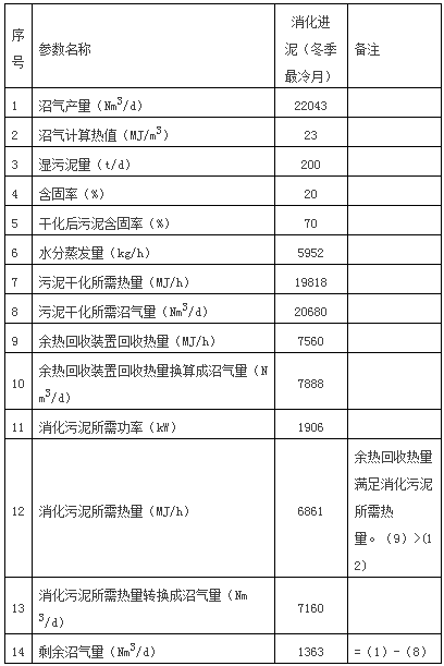 污泥厭氧消化主要設(shè)計(jì)參數(shù)如下:污泥近期干固體量為115tDS/d,沼氣產(chǎn)量為22043m3/d,污泥消化溫度介于33~35℃,系統(tǒng)需熱量為1906kW(冬季)。