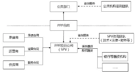 PPP 項目是一項參與者眾多、組織結(jié)構(gòu)復雜的系統(tǒng)工程。一個完善的 PPP 項目需要協(xié)調(diào)公共部門與不同類型企業(yè)(包括承建商、運營商、投資機構(gòu)等)之間的關(guān)系,以達到多方共贏的目的,因此咨詢團隊的作用就非常關(guān)鍵。根據(jù)上述美國馬里蘭州的案例,以及發(fā)達國家 PPP 項目的經(jīng)驗,政府部門和企業(yè)通常按比例投入一定資本籌建 PPP 項目公司(即 SPV),該項目公司通過銀行等金融機構(gòu)獲得債券融資,并且分別與承建商、運營商、供應(yīng)商簽訂建造合同、運營維護合同、設(shè)備采購或供貨合同,其中建造合同可能是采取 EPC 或其他承包形式。與此同時,政府部門將特許經(jīng)營權(quán)轉(zhuǎn)讓給 PPP 項目公司。上述過程之中,無論公共部門或是企業(yè)都需要聘請咨詢團隊(如技術(shù)、法律和財務(wù))制定合理的 PPP 項目方案,PPP 項目的財務(wù)測算、風險評估、資金構(gòu)成、物有所值評價、財政承載能力分析等工作主要由商業(yè)咨詢團隊來完成;技術(shù)層面,PPP 項目的系統(tǒng)構(gòu)成、邊界劃分、建設(shè)與運營費用評估、績效考核體系等問題則需要專業(yè)技術(shù)咨詢團隊來支撐。圖 2表明了一個典型的PPP 項目中咨詢團隊與參與方建立的關(guān)系。
