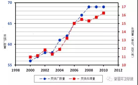 圖6.德國焚燒廠數(shù)量及焚燒處理量隨時間的變化