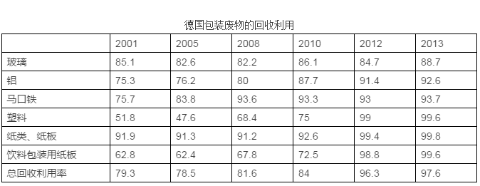 在德國,最常見的包裝材料有玻璃、鋁、馬口鐵、塑料、紙、紙板、木材,全部都能夠被用作二次原料,從而減少對原生原料的需求,可以起到降低能源消耗及污染排放的作用。根據(jù)《包裝條例》的規(guī)定,居民應(yīng)當對包裝廢物進行分類投放。條例獲得了廣泛的公眾支持,2013年時德國包裝廢物的回收利用率達到了97%。