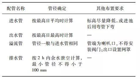1、調(diào)蓄與管配廠區(qū)所有清水池調(diào)蓄容積之和應(yīng)根據(jù)式(1)及式(2)確定。下疊清水池各管配件布置原則與傳統(tǒng)清水池相同,應(yīng)根據(jù)手冊上要求按表1配套設(shè)計進水管、出水管、溢流管和排水管等管配件。