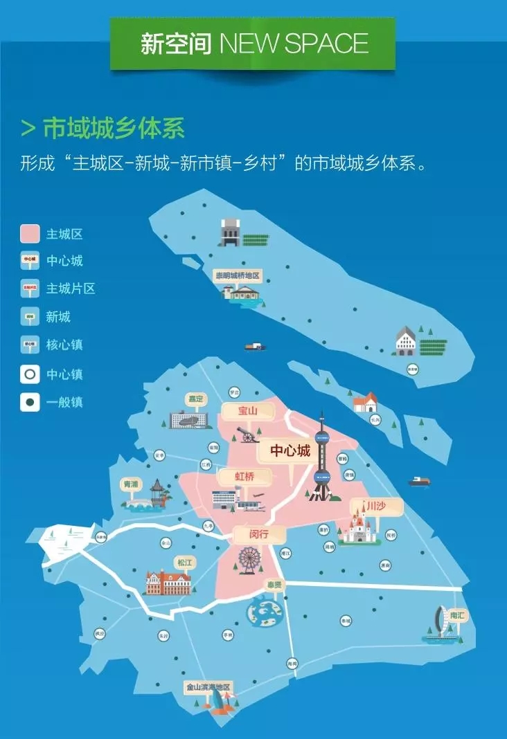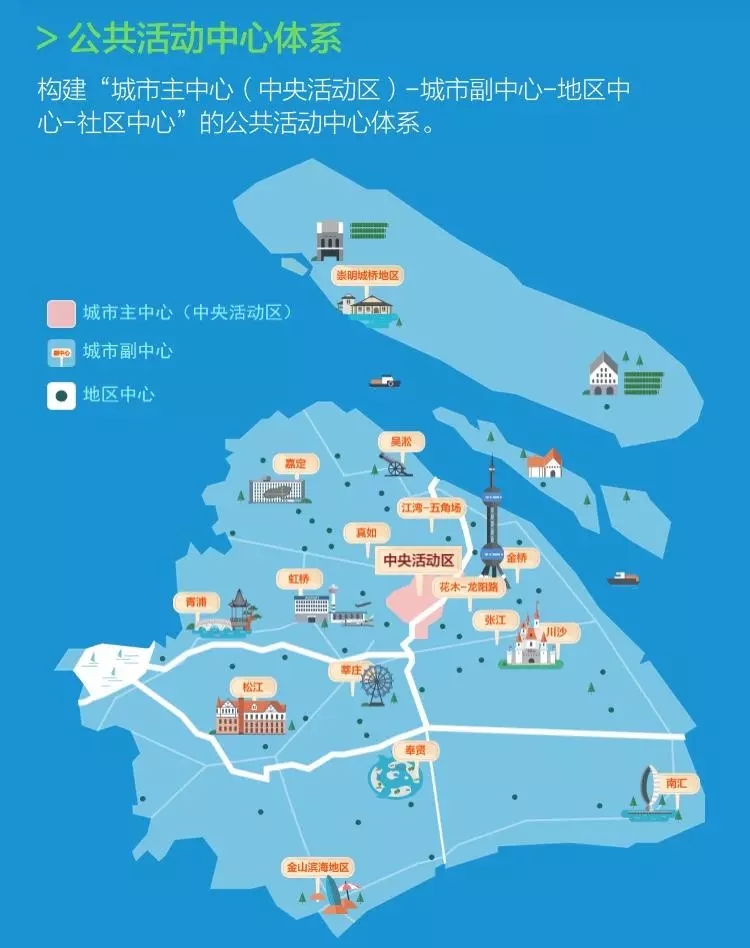 中央活動區(qū)包括小陸家嘴、外灘、人民廣場、徐家匯等十幾個區(qū)域,重點發(fā)展金融服務(wù)、總部經(jīng)濟(jì)、商務(wù)辦公、文化娛樂、創(chuàng)新創(chuàng)意、旅游觀光等全球城市核心功能。城市副中心包括五角場等9個主城副中心、5個新城中心和金山濱海地區(qū)、崇明城橋地區(qū)2個核心鎮(zhèn)中心等,發(fā)展面向長三角和市域的綜合服務(wù)中心,兼顧全球城市部分核心功能。地區(qū)中心和社區(qū)中心主要承擔(dān)所在區(qū)域的公共服務(wù)。