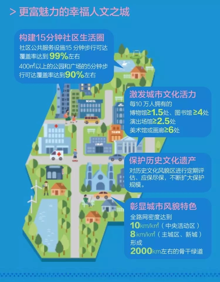 打造15分鐘生活圈,營造幸福宜居社區(qū)。包括:打造宜居、宜業(yè)、宜學(xué)、宜游的社區(qū),優(yōu)化社區(qū)生活、就業(yè)和出行環(huán)境,建設(shè)TOD社區(qū),為城市居民提供一個全時段運營的城市。提供覆蓋全年齡段的公共服務(wù)保障,社區(qū)公共服務(wù)設(shè)施15分鐘步行可達(dá)覆蓋率將達(dá)到99%左右。加快建立多主體供給、多渠道保障、租購并舉的住房制度。多渠道增加租賃性住房比重,至2035年,政府及機構(gòu)持有的租賃性住房比重約8-10%。提供人才公寓、國際化社區(qū)、適老性住宅等滿足市民多層次、多樣化的住房需求。