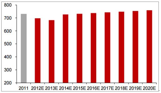 由于環(huán)保政策的更新和更加嚴(yán)格,2011年全國(guó)工業(yè)污水處理費(fèi)用為1.26元/噸,根據(jù)我們預(yù)測(cè)2020年單位工業(yè)污水處理費(fèi)用將達(dá)到1.94元/噸。2011年全國(guó)污水處理總量為580億噸,2011年至2014年全國(guó)工業(yè)污水總處理量成持續(xù)下降趨勢(shì),CAGR為-3.97%。以此趨勢(shì),我們估計(jì)2020年全國(guó)工業(yè)污水處理總量將減少至391億噸,屆時(shí)全國(guó)工業(yè)污水處理市場(chǎng)將達(dá)到759億元規(guī)模,由于處理成本增速大于工業(yè)污水處理總量的降幅,行業(yè)總體呈現(xiàn)逐年平穩(wěn)增加趨勢(shì)。