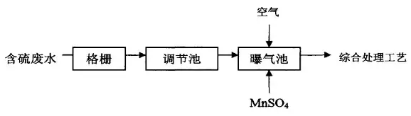 脫脂廢水通過酸處理調(diào)節(jié)PH破乳,再將破乳后的油脂經(jīng)氣浮法處理達到油水分離,污水排至綜合廢水調(diào)節(jié)池。含硫廢水可采用鐵鹽沉降法、化學(xué)混凝法、催化氧化法等,一般多使用催化氧化進行預(yù)處理,如下圖。