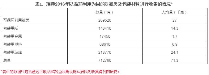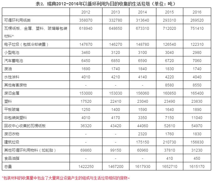 2016年時(shí),瑞典總共循環(huán)利用了161.517萬噸的生活垃圾,相當(dāng)于每人每年162千克,與2015年相比減少了2.3%,減少的主要原因?yàn)榻ㄖ臏p少,包括屋面瓦、纖維玻璃、破損的陶瓷器等。上述對以循環(huán)利用為目的進(jìn)行的收集量統(tǒng)計(jì),包括居民向生產(chǎn)商建立的循環(huán)利用系統(tǒng)投放的包裝和可循環(huán)利用的紙制品。這一部+