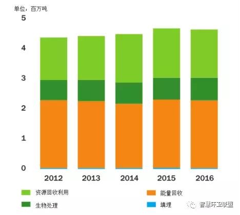 *圖表中以各種處置方法為目的進(jìn)行的收集量與各種方法的實(shí)際處置量間存在一定的差別。對資源回收利用和厭氧消化來說,收集量和處置量存在差別的原因是,一部分廢物在達(dá)到處理階段后被發(fā)現(xiàn)不符合處理的要求,通常都會(huì)在焚燒廠接受能量回收處理,因此也是能量回收的處理量稍稍高于以此為目的的收集量的原因。建筑垃圾資源回收的實(shí)際處理量要高于收集量,原因是焚燒廠產(chǎn)生的金屬和底灰會(huì)在分類后,得到循環(huán)利用。近年來,實(shí)際接受填埋處理的廢物量要原告于以填埋為目的而進(jìn)行收集的量,主要原因之一是焚燒廠能量回收會(huì)產(chǎn)生大量飛灰,只能接受填埋處置。
