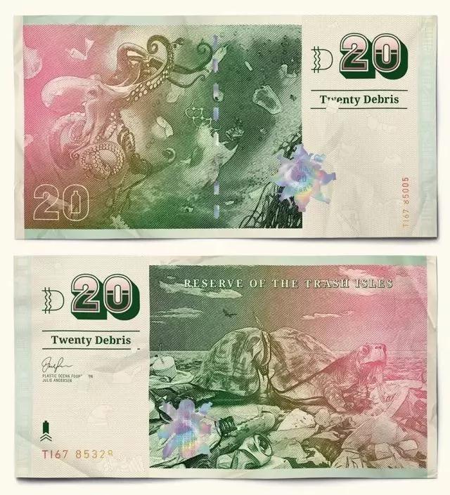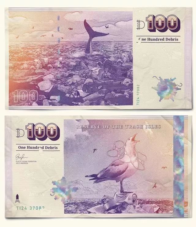 其他國家的貨幣都是領(lǐng)導(dǎo)人或風(fēng)景名勝,垃圾群島共和國的貨幣則獨樹一幟,均是動物遭受海洋垃圾迫害的慘烈場景。