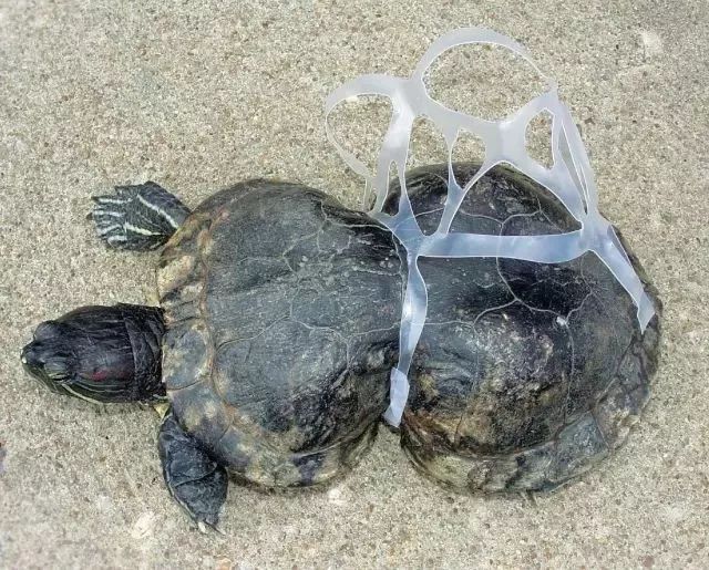 被塑料困住的小烏龜,身體變了形。