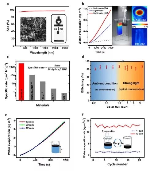 (e) 在10kWm -2以下太陽(yáng)能照射下,3DG在不同水量下的性能圖像;