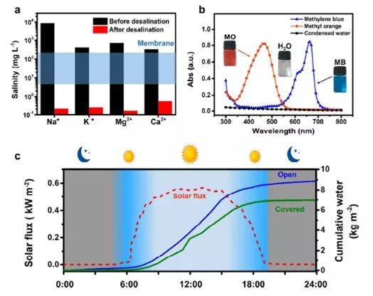 (c) 24小時(shí)持續(xù)測(cè)量太陽(yáng)通量和清潔水的生成圖像。記錄一整天(0:00-24:00)的環(huán)境太陽(yáng)通量(紅線(xiàn)),使用開(kāi)放設(shè)備產(chǎn)生的蒸汽量(藍(lán)線(xiàn))和使用覆蓋設(shè)備的冷凝水(綠線(xiàn))。