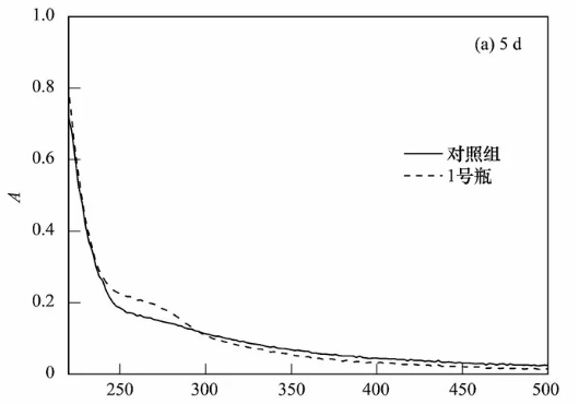 堆肥過程中DOM的變化被認(rèn)為是能靈敏反映堆肥腐熟狀況的重要指標(biāo),與堆肥的固相組分相比更具代表性,因此本實驗采用紫外-可見光譜共堆肥過程中DOM的光譜特征進(jìn)行了分析,而由前面的實驗結(jié)果可知,1號瓶的整體堆肥效果最佳,因此將1號瓶中的堆體與對照組進(jìn)行了分析,結(jié)果如圖5所示。