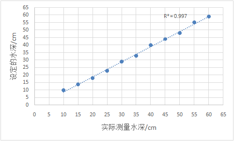 液位計傳感器是內(nèi)澇監(jiān)控點液位監(jiān)測系統(tǒng)的重要組成,其監(jiān)測數(shù)據(jù)直接影響到排水管網(wǎng)的調(diào)度管理決策及深隧排水系統(tǒng)的調(diào)度優(yōu)化研究結果。液位計傳感器需要選擇精度高、量程合適、穩(wěn)定性好的類型。此外,由于內(nèi)澇點通常位于城市的馬路上或人行道上,并且分布較為分散,電力和通訊設備難以匹配到位,應選取低能耗的類型;且排水管網(wǎng)的污水環(huán)境較為惡劣,需選用防水等級IP68、材質耐腐蝕的設備。針對本系統(tǒng)所選用的壓阻式液位傳感器,在實驗室模擬排水管道窨井,放入液位計并改變窨井中液位,進行實際測量液位與設定液位的線性回歸分析,測量液位值呈現(xiàn)的線性度良好,測量值與設定值線性相關系數(shù)為0.9975,誤差較小,精度符合要求(見圖2)。此外,在測試過程中,同一液位情況下,多次進行測量,測量液位變化不大,穩(wěn)定性良好。