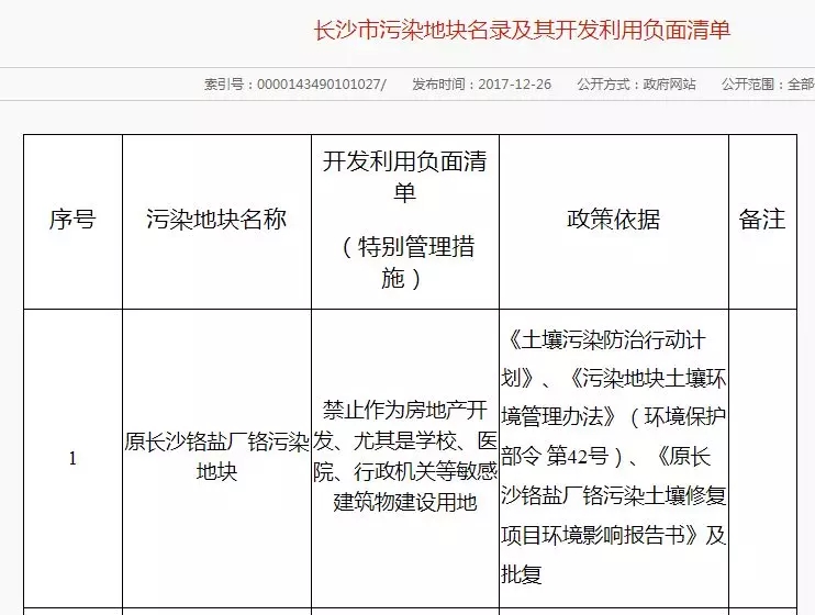 2017年12月26日 長沙市環(huán)境保護(hù)局公布了《長沙市污染地塊名錄及其開發(fā)利用負(fù)面清單》,共有6塊污染地塊。