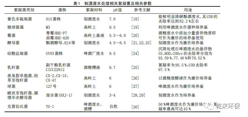 有關(guān)絮凝菌的報(bào)道起源很早,但有關(guān)制酒廢水的絮凝菌報(bào)道起步較晚。近年來有很多學(xué)者報(bào)道了在制酒廢水處理領(lǐng)域應(yīng)用較好的絮凝菌,主要有細(xì)菌、酵母、霉菌等,具體匯總見表1。