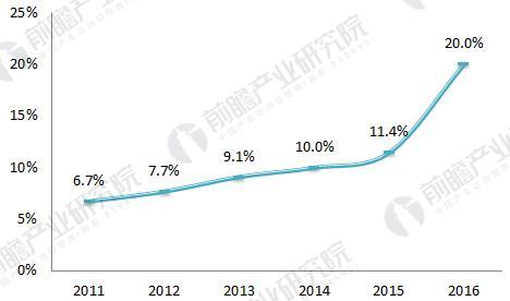 圖表3:2011-2016年中國(guó)對(duì)生活污水進(jìn)行處理的行政村比例(單位:%)