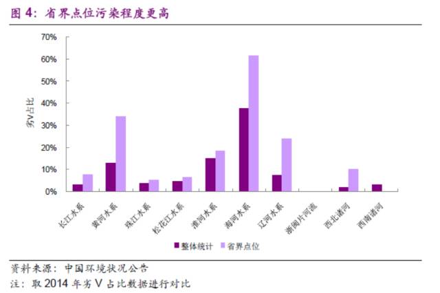 我國(guó)河流污染情況依舊嚴(yán)重,整體雖有所好轉(zhuǎn),但2011-2015年期間改善不明顯。根據(jù)2015年中國(guó)環(huán)境狀況公告顯示,長(zhǎng)江、黃河、珠江、松花江、淮河、海河、遼河等七大流域和浙閩片河流、西北諸河、西南諸河的700個(gè)國(guó)控點(diǎn)位中;IV類占14.3%,V類占4.7%,劣V類占8.9%且主要集中在海河、淮河、遼河和黃河流域。海河監(jiān)控點(diǎn)位水質(zhì)劣V類達(dá)到39.1%,其中支流劣V占比更是高達(dá)44.0%。