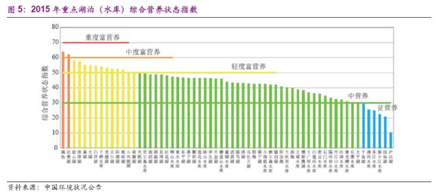 湖泊是重要的地表水資源,與人類的生活息息相關(guān),富營(yíng)養(yǎng)化不可忽視。2015年,開(kāi)展?fàn)I養(yǎng)狀態(tài)監(jiān)測(cè)的61個(gè)湖泊(水庫(kù))中,貧營(yíng)養(yǎng)的6個(gè);中營(yíng)養(yǎng)的41個(gè),輕度富營(yíng)養(yǎng)的12個(gè),中度富營(yíng)養(yǎng)的2個(gè)。
