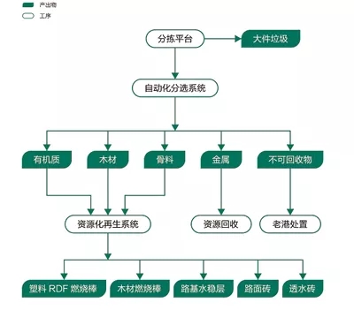 經(jīng)處理后的裝修垃圾主要分為成五大類,分別是:磚瓦等建筑廢棄物,一部分做成路基材料,一部分做成路面磚和透水磚;輕物質,塑料制品為主,可資源化利用做成塑料顆粒和RDF燃燒棒;木材,經(jīng)過加工處理變成燃燒棒;金屬物質,直接出售給資源回收企業(yè);有毒有害垃圾,移交有資質的危費處理企業(yè)。