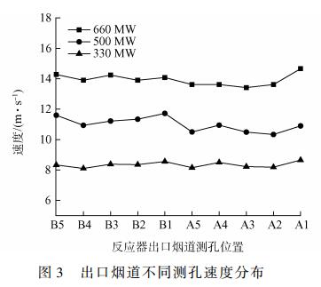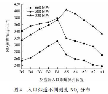2)在660、500、330MW負荷下,反應(yīng)器入口煙道NOx均值偏差分別為13.4%、17.1%、18.1%,而速度均值偏差分別為6.1%、6.4%、6.6%。不同測孔位置濃度場分布差異性較大,是噴氨格柵優(yōu)化調(diào)整的一個不可忽視的重要因素,而反應(yīng)器入口速度場分布相對均勻,對噴氨格柵優(yōu)化調(diào)整影響較小。