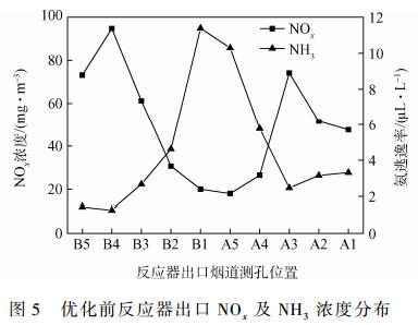 從圖5可以看出,根據(jù)出口NOx濃度和氨逃逸濃度的對應(yīng)關(guān)系,NOx濃度較低的區(qū)域?qū)?yīng)較大的噴氨量,極易產(chǎn)生較大氨逃逸濃度。B1、A5等2個測孔位置出口NOx濃度均小于20mg?m-3,其代價是很大的噴氨量和較高的氨逃逸。