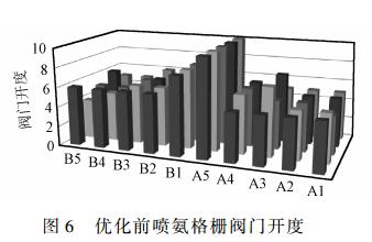 調(diào)前、調(diào)后噴氨格柵閥門開度分別見圖6、圖7。