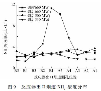 可知,機組調(diào)前在660MW負荷下,均值濃度分別為56、43.5mg?m-3,但不同測孔的NOx濃度差異較大,其中B側(cè)NOx濃度最大偏差為74.7mg?m-3、而A側(cè)為56.2mg?m-3。噴氨格柵優(yōu)化調(diào)整后,NOx均值濃度基本不變,而在660、500、330MW負荷下,NOx濃度差異性均明顯降低,B側(cè)最大偏差分別降至3.9、13.6、8.6mg?m-3,而A側(cè)對應(yīng)偏差分別為7.9、7.0、15.1mg?m-3。