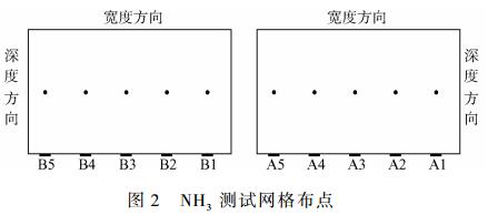 通過網(wǎng)格布點測量SCR裝置的入口及出口煙道,煙道共布置10個測孔,編號依次為B5→B1、A5→A1,其中NO、O2取樣點共選取2×5×5個(取深度方向5點均值),NH3取樣點共選取2×5×1個,具體布置如圖1所示。NO、O2經(jīng)Testo350煙氣分析儀直接測定,氨逃逸樣品采用美國EPA的CTM-027標準以化學(xué)溶液法采集,取樣時間20min。通過分析樣品溶液中的氨濃度(見圖2),并根據(jù)所采集的干態(tài)煙氣流量和O2,計算各點干基煙氣NH3濃度。