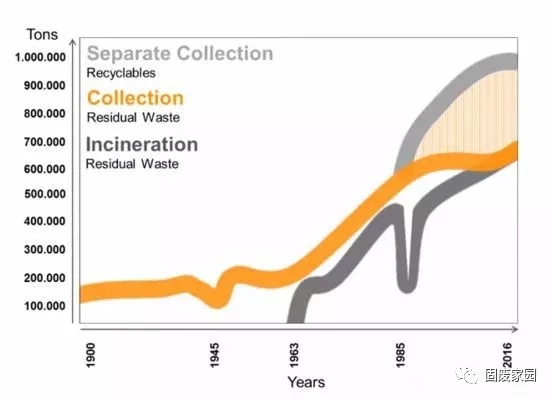 1960 年左右,二戰(zhàn)后的維也納經(jīng)濟(jì)復(fù)蘇,伴隨著人口增長(zhǎng),加上包裝行業(yè)新起,垃圾數(shù)量迅速增長(zhǎng)。也是在那個(gè)時(shí)間段,維也納開(kāi)始焚燒垃圾,并且在 1980 年代開(kāi)始將垃圾區(qū)分為可回收和不可回收。此后垃圾數(shù)量有增無(wú)減,直到2016年才相對(duì)穩(wěn)定。