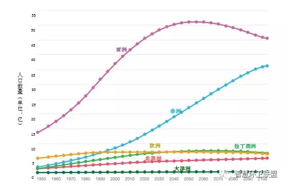 聯(lián)合國的《世界人口展望》對全球未來的人口直到2100年的趨勢做出了預(yù)測,雖然報(bào)告中對未來30年以后的趨勢做出了差別較大的多種預(yù)測,但仍然能夠看出未來全球人口發(fā)展的總體趨勢將會是,首先上升,之后趨于平穩(wěn),最后既有可能達(dá)到平衡狀態(tài),也有可能開始下降。根據(jù)預(yù)測,亞洲的人口將會在2050年左右達(dá)到峰值,而非洲人口則會一直到2100年維持增長的趨勢。圖4展示了全球各地區(qū)自1950年起,到2100年的變化趨勢。