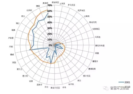 歐盟成員國會定期收集回收利用率的數(shù)據(jù),因此擁有系統(tǒng)的數(shù)據(jù)記錄,但即便如此,成員國對回收利用的定義卻也仍然存在差異——一些國家將以回收利用為目的進(jìn)行收集的比例當(dāng)作回收利用率,一些國家則利用資源回收利用設(shè)施和堆肥設(shè)施的輸出作為計(jì)算的依據(jù);一些國家將焚燒發(fā)電廠最后排出的金屬和集料算入了回收利用率,另一些則將這一部分排除在外。圖9展示了歐盟各成員國在2001年和2011年時(shí)的回收利用率,可以看出,隨著回收利用率較低的成員國向著歐盟目標(biāo)的不斷努力,歐盟的總體回收利用率出現(xiàn)了十分明顯的提升。