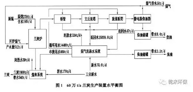 1.3蘭炭生產(chǎn)廢水:蘭炭生產(chǎn)屬于煤中溫干餾過(guò)程,干餾過(guò)程及煤氣凈化過(guò)程中形成的廢水稱(chēng)為蘭炭生產(chǎn)廢水。蘭炭生產(chǎn)廢水是一種高COD、高酚類(lèi)、高氨氮、難降解的有機(jī)廢水,與焦化廢水相比,蘭炭生產(chǎn)廢水COD要高10倍左右,酚類(lèi)、氨氮的濃度也遠(yuǎn)高于焦化廢水。因此,蘭炭生產(chǎn)廢水更難于處理。60萬(wàn)t/a蘭炭生產(chǎn)裝置水平衡圖如圖1所示。