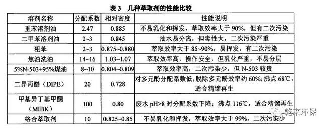 幾種脫酚萃取劑性能對(duì)比,見(jiàn)下表3所示。