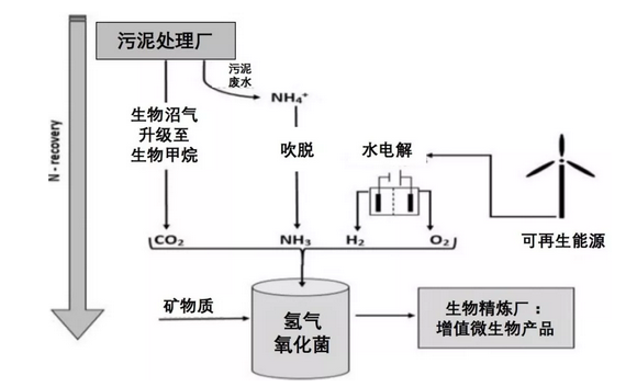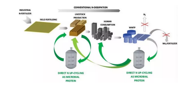 2015年5月,IWA厭氧專家組成員、比利時(shí)根特大學(xué)的Willy Verstraete教授和他的學(xué)生Silvio Matassa在期刊《環(huán)境科學(xué)與工程(ES&T)》發(fā)表了題為“Can direct conversion of used nitrogen to new feed andprotein help feed the world?”的文章,提出了一種新的轉(zhuǎn)化路徑——能量到蛋白質(zhì)(power-to-protein)。其本質(zhì)是直接將污水中的氨氮轉(zhuǎn)化成微生物蛋白質(zhì),跳過氮?dú)廪D(zhuǎn)化這一步,形成一個(gè)抄近路的氮循環(huán)的升級(jí)模式。這是一種可持續(xù)的蛋白質(zhì)生產(chǎn)方式,它比傳統(tǒng)經(jīng)典方法耗能更少,并且將“廢物”轉(zhuǎn)化為高附加值的產(chǎn)品。