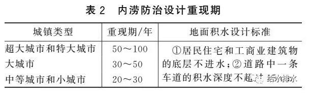 《Urban Storm Drainage Criteria Manual》對于內澇防治設計重現期時的道路積水有詳細規(guī)定,我國《室外排水設計規(guī)范》有類似規(guī)定,見表2。