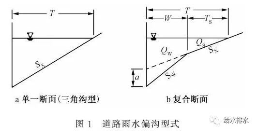 道路雨水偏溝主要有2種型式:單一斷面和復合斷面(見圖1)。出于計算簡便的需要,僅介紹單一斷面(三角溝型)的計算方法。