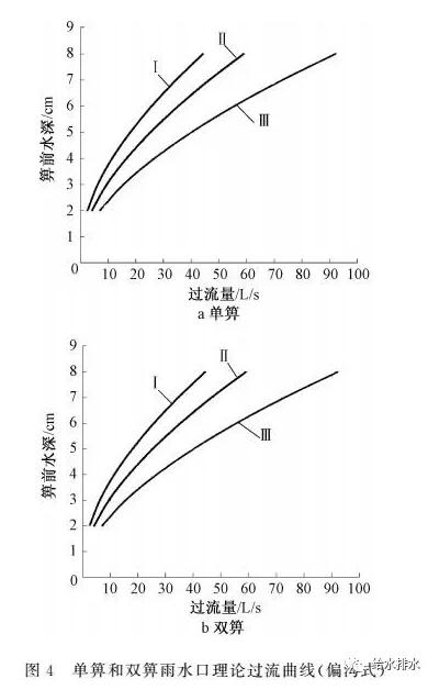 當箅前水深大于40 mm時,圖集還提供了雨水口過流曲線圖供設計人員查找,見圖3。圖中Ⅰ、Ⅱ、Ⅲ型分別為道路縱坡0.3%、1.0%和3.5%。