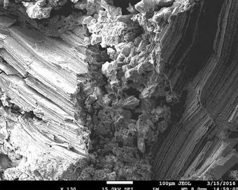根據(jù)化學分析結(jié)果可見,除霧器上的垢物與石膏的組成較為接近,主要成分均為CaS04˙2H20。結(jié)合除霧器的工作機理,可以認為除霧器的垢物與石膏的來源均為脫硫漿液所攜帶的固體顆粒物。但是掃描電鏡微觀顯示其晶體形態(tài)完全不同,除霧器垢物是顆粒與片狀晶體的混合物,而脫硫石膏呈現(xiàn)出顆粒狀(或短柱狀)晶體結(jié)構(gòu)。