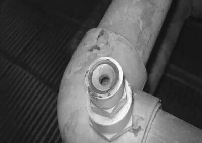 在事故發(fā)生后,檢修人員對該機組沖洗水管道和噴嘴進行了逐個檢查,結(jié)果表明50多個噴嘴發(fā)生了堵塞或脫落。原因是噴嘴形式為軸向?qū)嵭腻F,外觀如圖3所示,兩級除霧器下表面沖洗水管上的噴嘴均為噴口向上,除霧器葉片上脫落的軟垢極易進入噴嘴的出口,由于不是連續(xù)沖洗,噴嘴出口堆積的軟垢經(jīng)過一段時間的停留,會變得結(jié)實從而造成噴嘴堵塞。