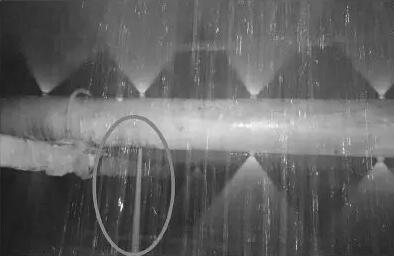 另外當沖洗水含固量較高或存在異物時,也會造成噴嘴堵塞。在后續(xù)運行中,發(fā)生噴嘴堵塞的區(qū)域形成沖洗死角,除霧器葉片無法得到?jīng)_洗,極易結(jié)垢。另外還有部分沖洗水噴嘴脫落或沖洗水管斷裂,也會大大降低沖洗效果。如圖4所示,紅圈處的噴嘴脫落,沖洗水成柱狀下流,沖洗面積大大減小,所對應的區(qū)域?qū)o法得到有效沖洗。此類故障在運行中難以發(fā)現(xiàn),需要每次停機時加強檢修,及時將脫落和堵塞的噴嘴進行修復。