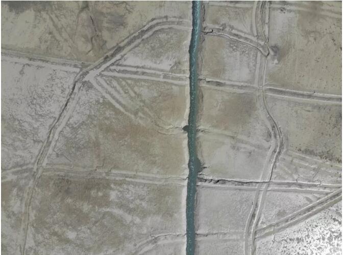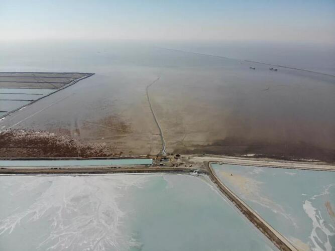 唐山市曹妃甸工業(yè)區(qū)的一個(gè)入海排污口,污水流過(guò)灘涂形成溝壑。 羅逸爵丨攝
