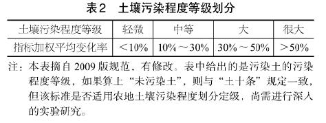 (4)土壤污染程度等級劃分。土壤污染程度是指侵入土壤的致污物質(zhì)對土壤成分及土體結(jié)構(gòu)和性質(zhì)的綜合影響程度,不僅指土壤成分和結(jié)構(gòu)的變化程度,還包括土體強(qiáng)度、變形、滲透、腐蝕、吸附、酸堿度、氧化還原、生物養(yǎng)分、毒性等的變化程度,具體視土壤污染程度評價的目的而定,對于農(nóng)地土壤,宜側(cè)重于土壤化學(xué)成分評價;對建設(shè)用地,宜側(cè)重于土體強(qiáng)度、變形等力學(xué)性質(zhì)評價。確定土壤污染程度時,應(yīng)首先分別計算出每種致污物質(zhì)所引起的土壤成分、結(jié)構(gòu)和各種性質(zhì)指標(biāo)變化的變化率(污染前后指標(biāo)的差值與污染前指標(biāo)值之百分比)。然后,分別計算各指標(biāo)變化率的平均值。然后,再計算各指標(biāo)平均變化率的加權(quán)平均值。最后,依據(jù)加權(quán)平均變化率按表2確定土壤污染程度等級。