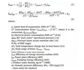 MSF和RO的能耗對(duì)比一般用以下公式進(jìn)行計(jì)算,其中公式(1)計(jì)算MSF熱法淡化的單位能耗,公式(2)則對(duì)應(yīng)RO的單位能耗。