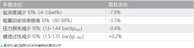 在SED的分析中我們可以得到一些很基礎(chǔ)的重要信息:通過(guò)對(duì)四個(gè)重要參數(shù)各自改善10%對(duì)能耗變化的計(jì)算可以看出,鹽濃度是最顯著的影響因素,而它又主要受濃差極化現(xiàn)象影響。從這個(gè)角度來(lái)看,與研發(fā)諸如碳納米管等自身具有高滲透性的膜相比,優(yōu)化系統(tǒng)的流體力學(xué)獲得好處更多。