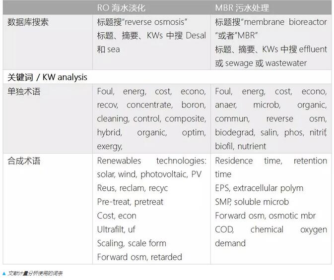 在分析膜技術(shù)的研究趨勢(shì)方面,Simon Judd教授使用下表的文獻(xiàn)計(jì)量分析方法對(duì)RO海水淡化和MBR污水處理的關(guān)鍵詞進(jìn)行了搜索統(tǒng)計(jì)。